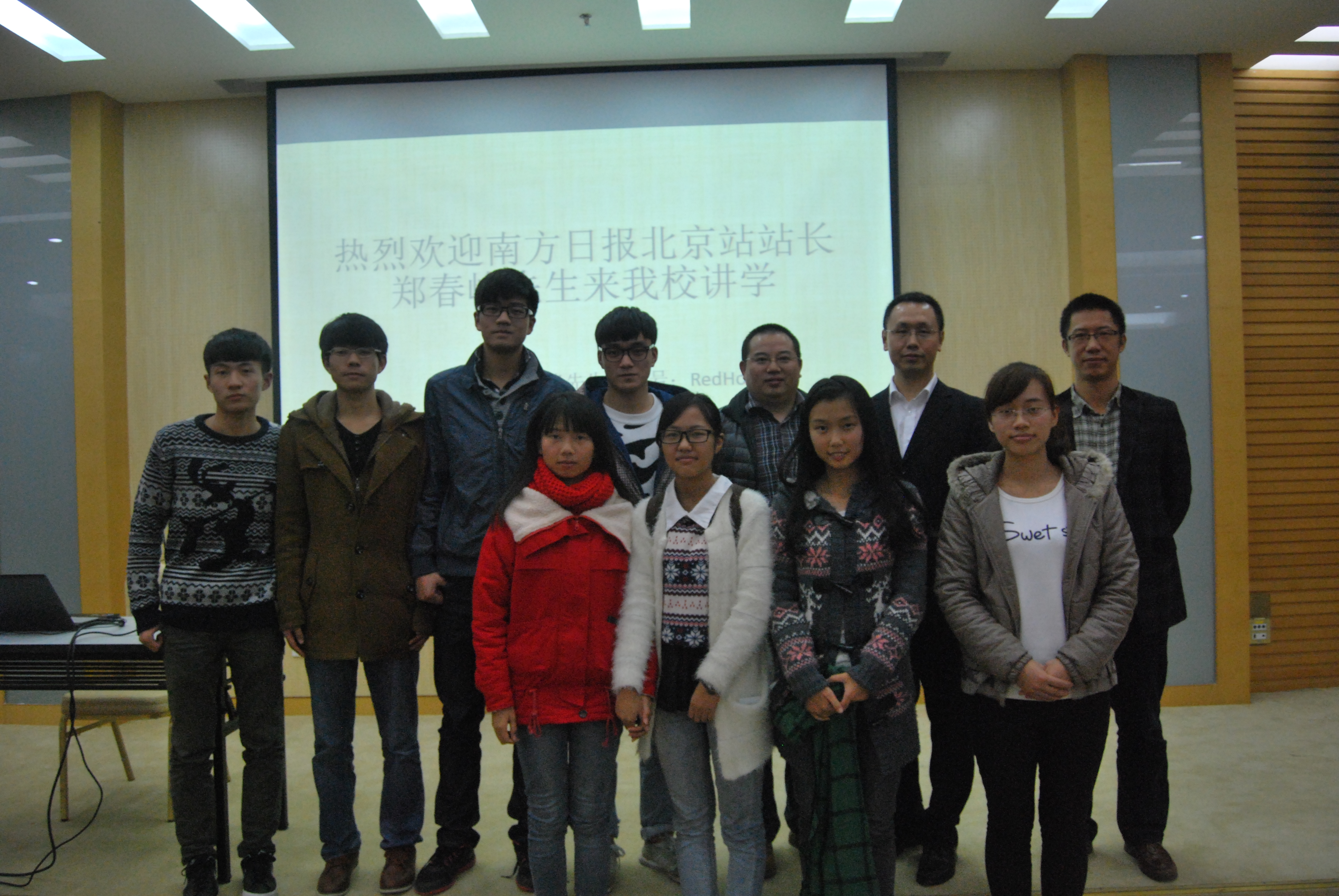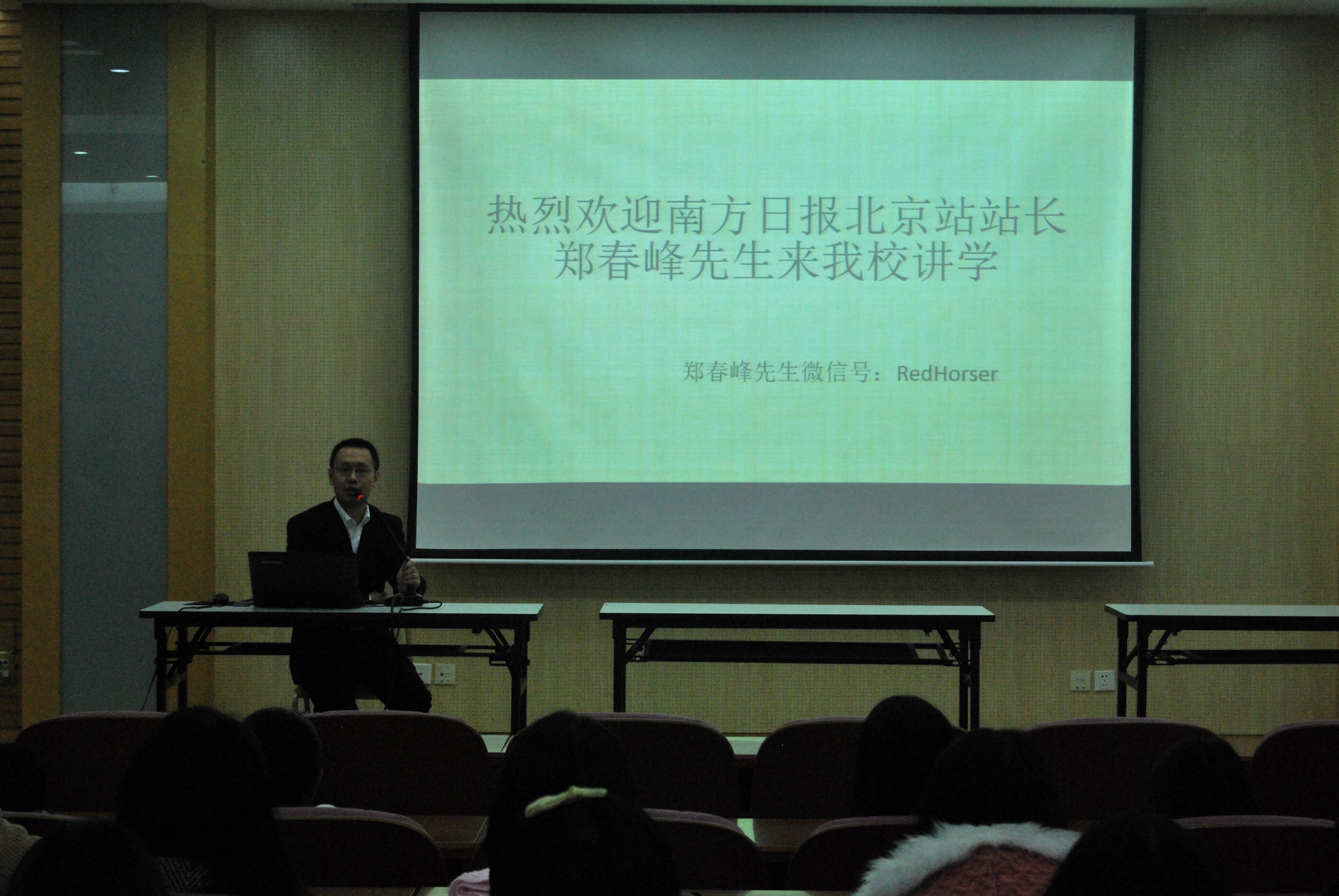 本网讯(通讯员陈锐 廖程)11月23日晚,在太阳成集团tyc33455cc的陈建华经理邀请下,南方日报北京站站长郑春峰先生在老员工活动中心六号报告厅,为太阳成集团tyc33455cc大一员工就新闻学的历史、发展和就业前景发表演讲。