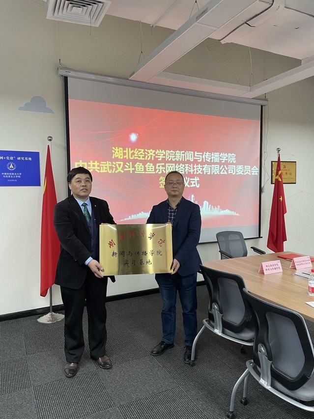 本网讯 3月31日,学院与武汉斗鱼网络科技有限公司共建实践教学基地举行挂牌仪式。武汉斗鱼鱼乐网络科技有限公司党委书记、副总裁袁刚先生,公司党委委员、副经理彭书雄教授分别代表双方签署了校企、校媒合作协议。