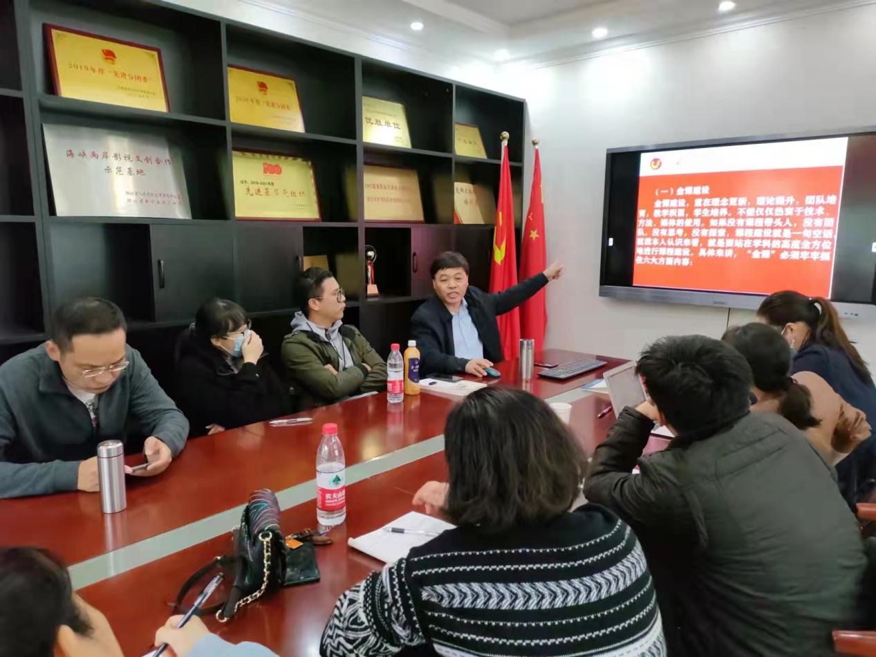 本网讯 (通讯员杨帅)根据一流本科课程“国家双万计划”—“湖北省一流课程”建设要求,公司大学语文教学团队将定期开展大学语文课程集体备课活动。首次集体备课活动于2021年10月14日下午在学院研讨室召开。本次集体备课的主题是“新文科背景下的大学语文‘金课’建设”,由课程负责人彭书雄教授主讲,中文系全体教师参加了研讨。