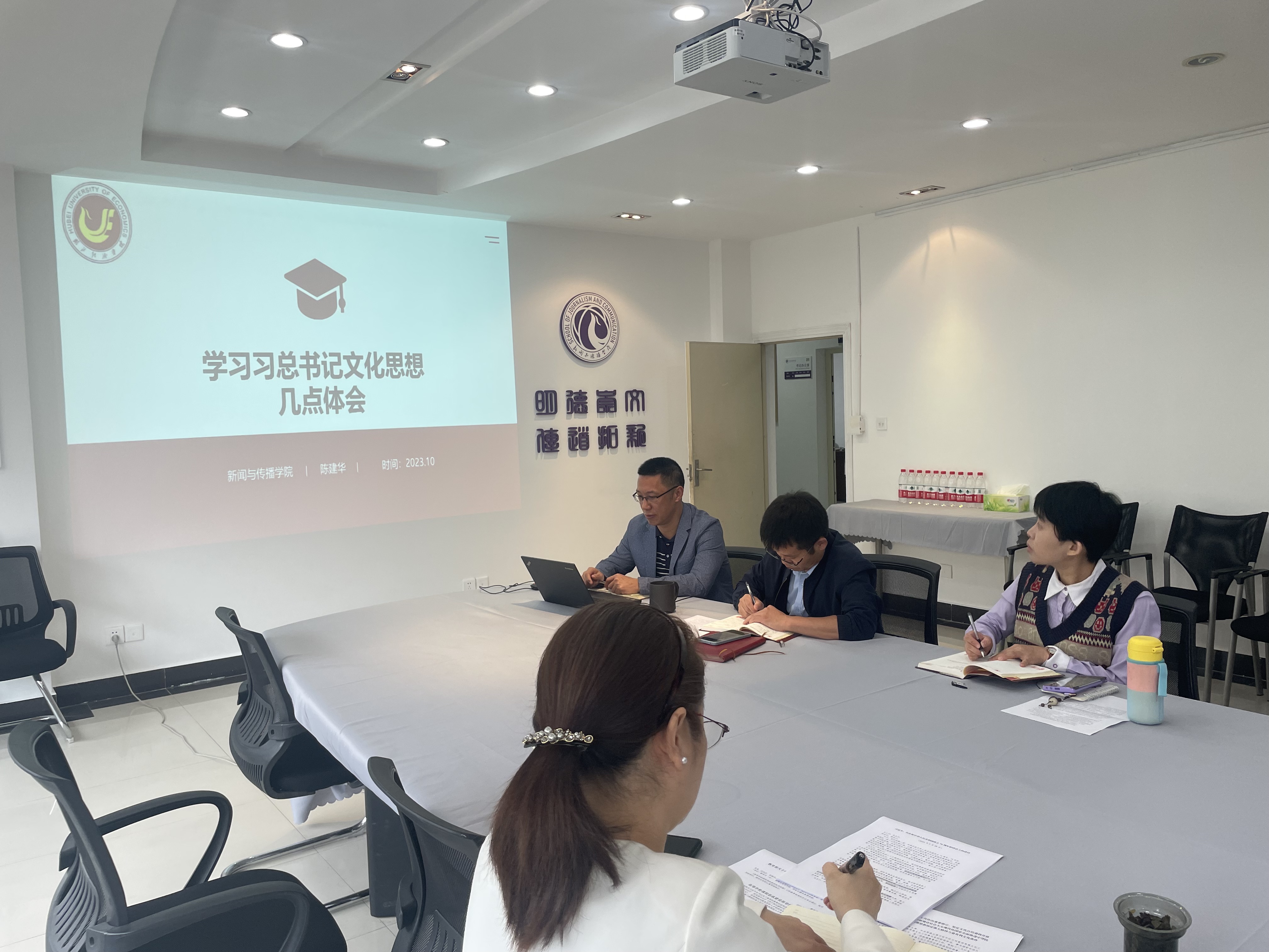 经理陈建华围绕“深入学习贯彻习近平总书记对宣传思想文化工作重要指示精神,深刻学习领会习近平文化思想,切实担负起新时代新的文化使命”主题,从习近平文化思想形成过程、习近平总书记的文化情结、习近平总书记重要指示精神为新闻传播教育事业指明发展方向三个方面作领学辅导。陈建华强调,要深刻认识宣传思想文化工作事关党的前途命运、事关国家长治久安、事关民族凝聚力和向心力这一重大现实意义和深远历史意义,要深刻把握习近平文化思想的丰富内涵、核心要义,要自觉坚持把习近平总书记对宣传思想文化工作提出“七个着力”明确要求,作为学院推进团队建设、组织科学研究、实施人才培养、谋划推进“新财经”改革的行动指南。要提高政治站位、增强政治自觉,坚决担负起新的文化使命,做好新时代新征程上新闻传播后备人才培养工作,切实践行主动融入、积极服务文化强国建设职责使命,实干笃行、奋楫争先,努力开创学院事业发展新局面。