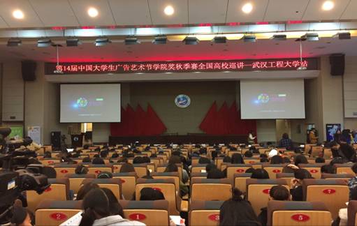 2016年11月8日第十四届全国老员工广告艺术节秋季赛巡讲武汉站宣讲会在武汉工程大学流芳校区举行。张勤老师带队太阳成集团tyc33455cc参赛代表17余人,前往宣讲会现场。