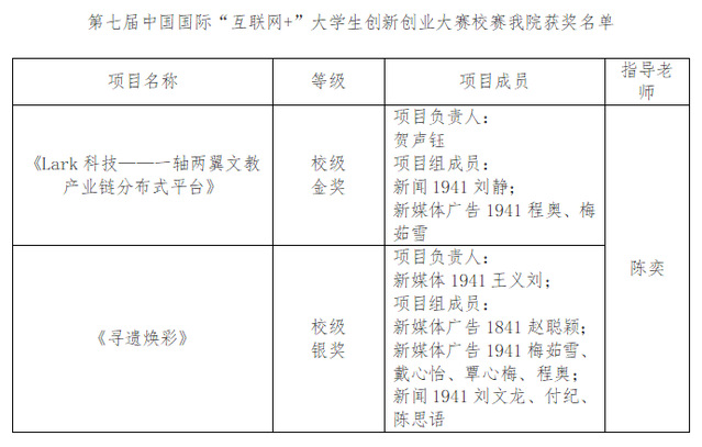 本网讯(通讯员 付纪) 9月23日,学校正式公布了第七届中国国际“互联网+”老员工创新创业大赛校决赛的获奖名单。公司陈奕老师指导的两个项目分别获得校级金奖与银奖,取得省级比赛的资格。两个项目共有包括公司王义刘在内的10名同学参与。