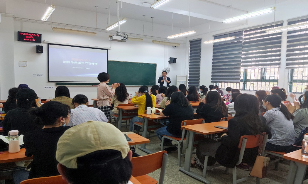 本网讯(通讯员 刘洋洋) “技术要与时俱进地学,但作为员工,传统写作更重要!”“五•四”青年节当天,从新闻1941班《影视传播学》课堂不时传来铿锵有力的话语声和热烈的掌声。应任课教师陈奕的邀请,公司特聘产业导师、湖北广电长江云编辑部主任邓国辉走进课堂,作了主题名为“跃进web3.0:融媒体新闻生产与传播”的讲座。据悉,此次讲座属于公司业界团队进课堂系列活动之一。